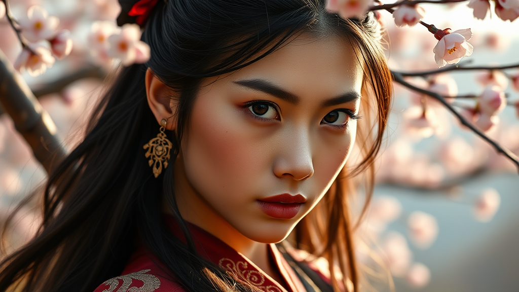 Fullbody portrait of a warrior princess inspired by Mulan, intricate detail, 30-megapixel, ultra-high-definition, 85-mm-lens, crystal-clear focus, f:8, ISO 100, shutter-speed 1:125, soft ambient backlighting, prize-winning photograph, subtle catchlight in eyes, exceptional sharpness, balanced facial features, 8k resolution, evoking grace and strength with serene poise, in a landscape with gentle sakura trees in bloom.