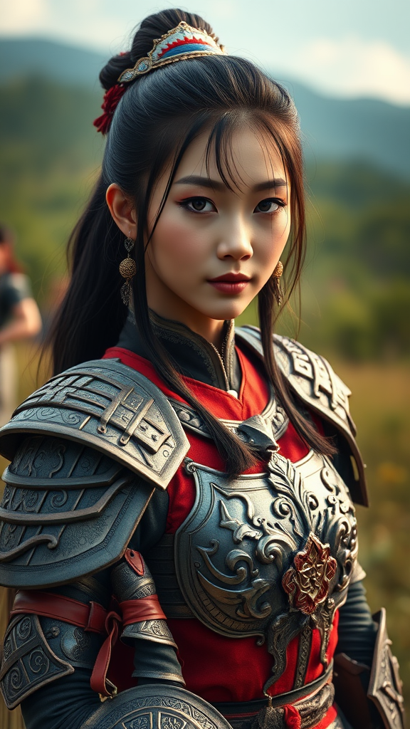 Fullbody portrait of a warrior princess inspired by Mulan from Disney, adorned in intricately detailed armor, set in a lush landscape, 30-megapixel, high-resolution 4k image, taken with an 85-mm lens, sharp focus, f/8 aperture, ISO 100, shutter speed 1/125, softly diffuse back-lighting, image captures award-winning quality, enhanced by subtle catchlight in the eyes, meticulously defined facial features ensuring high sharpness and perfect symmetry, captures essence of strength and grace, breathtaking 8k clarity with an aspect ratio subtly elongated for a dynamic composition.