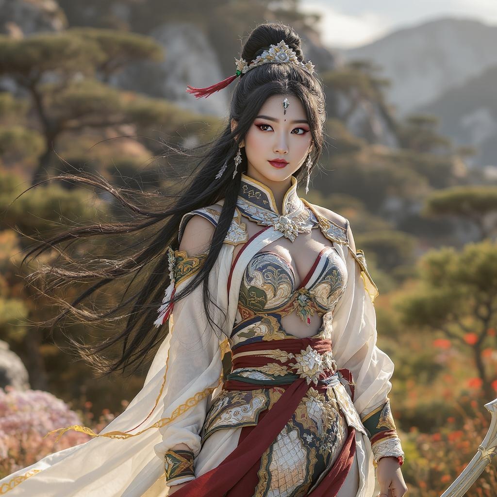 Fullbody portrait of a warrior princess inspired by Mulan from Disney, showcasing exquisite detail, captured in 30-megapixel resolution, 4k quality, using an 85-mm lens with sharp-focus, f:8, ISO 100, and shutter-speed 1:125. Features include diffuse back-lighting, small catchlight, high sharpness, and facial symmetry. The setting evokes an award-winning photograph, enriched with intricate designs on traditional attire, and a background that reflects harmony between nature and strength. The subject stands with grace and determination, evoking a sense of tranquility and courage.