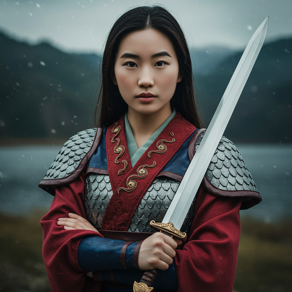 Fullbody portrait of a warrior princess inspired by Disney's Mulan, featuring exquisite detail and high-definition elements, captured in 30-megapixel, 4k resolution with an 85mm lens. The image is sharply focused with an aperture of f:8, ISO 100, and a shutter speed of 1/125. The portrait is enhanced with soft, diffuse backlighting, creating an award-winning photographic effect. The subject has a subtle, small catchlight in her eyes, emphasizing high sharpness and perfect facial symmetry. The background is a serene landscape, subtly adding depth to the composition, maintaining an ultra-wide aspect ratio, evoking an 8k visual experience.