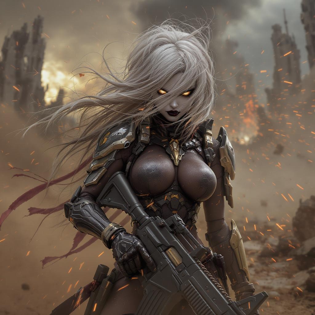 Furious female bjddoll with porcelain skin, warrior-like presence, piercing luminous eyes, flowing unruly hair, armed and dangerous, exuding a fierce attitude, enveloped in dust, set in a sci-fi cyberpunk universe, advanced tech and weaponry, apocalyptic ruins in the background, brewing storm, flying sparks, captured in ultra-high-definition, rich in vibrant details, creatively envisioned, designed for artstation quality, dynamic composition, fluid lighting, amidst war chaos, a true masterpiece in sharp focus.