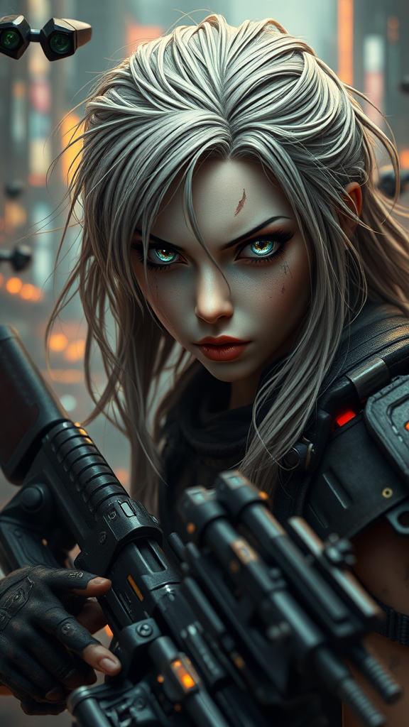 Furious girl bjddoll, ivory complexion, warrior, gleaming hypnotic eyes, lengthy tousled hair, armaments, fierce, debris, sci-fi, cyberpunk, advanced, tech-infused, dystopian metropolis backdrop, tempest, glowing embers, ultra-high definition, vivid intricacies, exceptional artistry, artstation, dynamic composition, seamless illumination, conflict, magnum opus, crystal-clear focus.