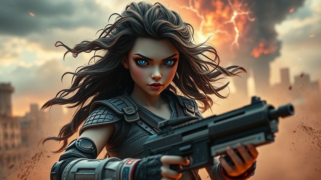 Furious girl bjddoll with porcelain skin, dressed as a warrior, possessing hypnotic iridescent eyes, and long untamed wavy hair, armed with a futuristic weapon. She exudes an aura of strength amidst swirling dust in a cyberpunk sci-fi setting. The apocalyptic cityscape looms in the background under a tempestuous sky, crackling with electric sparks. The scene is rendered in breathtaking 4k and 8k detail, highlighting vibrant, meticulously crafted elements. An expertly composed masterpiece with a dynamic aura, smooth lighting, and sharp focus, perfect for an action-packed, technology-driven narrative.