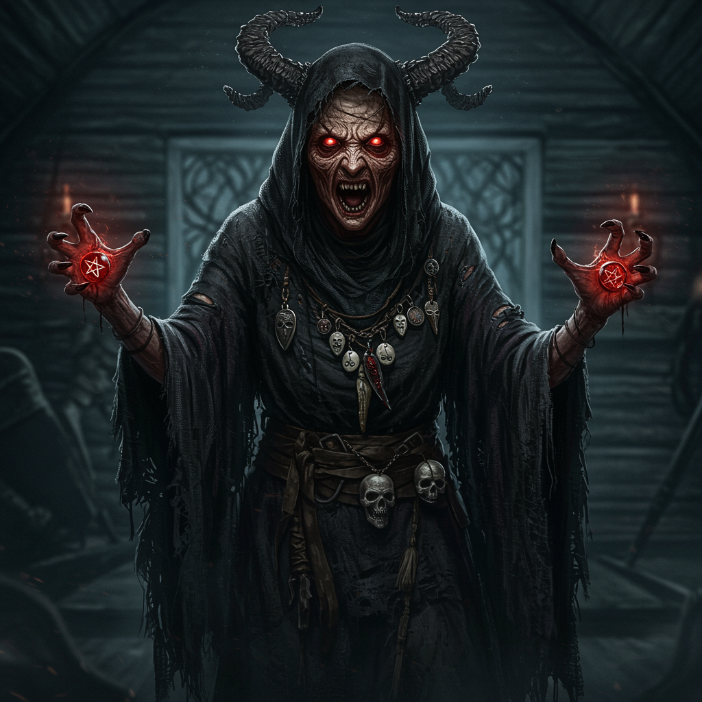 Furious infernal crone dwelling in a shadowy ancient cabin, draped in a grimy, black, ragged shroud; her face a map of deep wrinkles, malevolent crimson eyes glowing with dark magic. Adorned with arcane, sinister talismans, embodying unnatural wickedness and chilling dread. The setting is steeped in an atmosphere of horror and darkness, with meticulously crafted details that evoke unease. Dramatic, moody lighting highlights every photorealistic, cinematic contour, capturing an essence both diabolical and eerily captivating, rendered in stunning 8k detail.