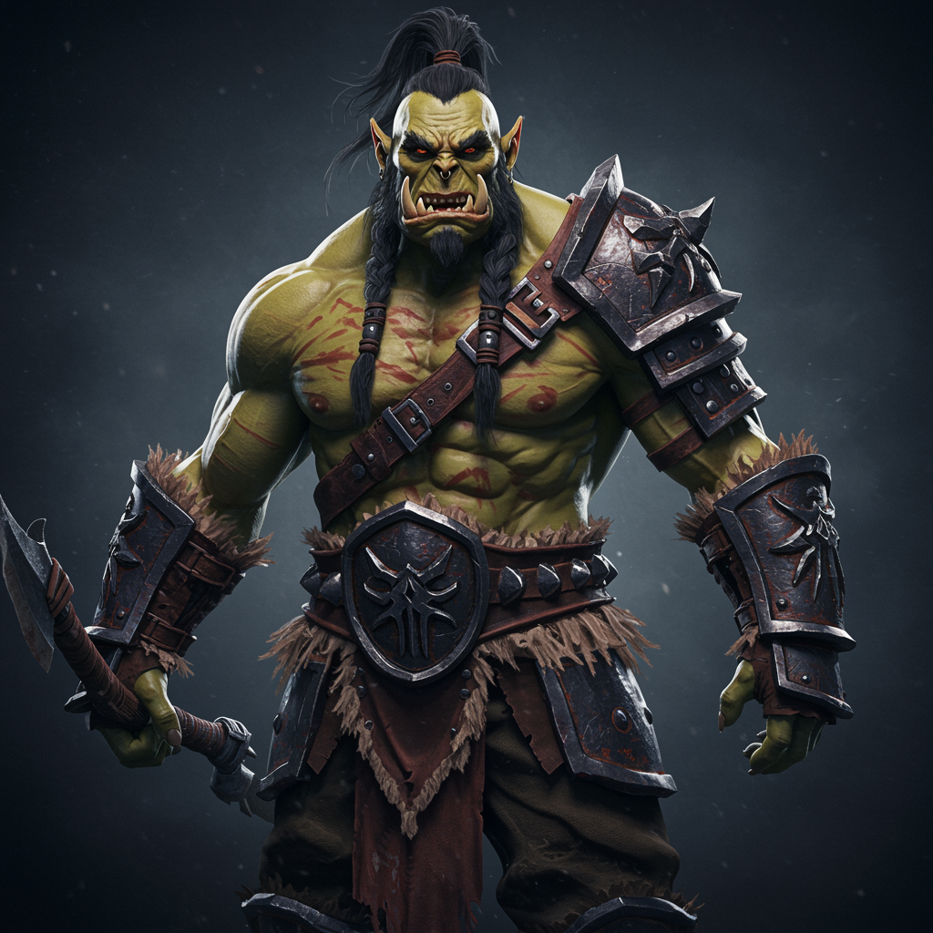 Furious orc leader depicted in a striking body portrait, exuding an air of intimidation and menacing power, captured from a low angle. The scene is infused with an aura of horror, rendered with octane for a smooth yet sharp focus, highlighting the chieftain's symmetrical face and intricate details. An artistic masterpiece, the image showcases trends from ArtStation, rendered in 4K HDR with the clarity of 35mm photography. Influences of artists Stanley Lau, Jason Chan, and Mark Hill are evident, with creative elements that enhance the core concept, perfectly centered for maximum impact.