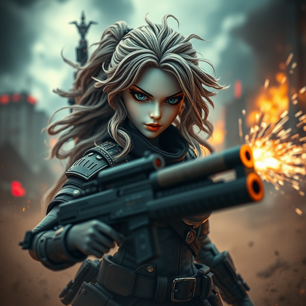 Furious warrior bjd doll with pale skin and captivating, glistening eyes, boasting long, wavy, tousled hair. Clad in soldier attire, she brandishes a formidable weapon, embodying a fierce and unyielding spirit. Surrounded by swirling dust, she stands in a cyberpunk sci-fi setting with an apocalyptic city looming in the background, under a tumultuous storm. Sparks fly around her in this vibrant, expertly crafted 4k masterpiece, bursting with intricate details. The composition captures a smooth interplay of light and shadows, highlighting the finely-tuned elements of war and advanced technology, blending action with a sharp focus on her mesmerizing demeanor.