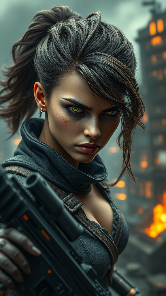 Furious young woman bjddoll, porcelain-like complexion, warrior attire, captivating luminous eyes, lengthy wavy untamed hair, armed, fierce demeanor, gritty, sci-fi, cyberpunk ambiance, advanced tech, post-apocalyptic metropolis in background, tempest, embers, ultra-high-definition, vivid intricacies, artistic brilliance, expert composition, dynamic scene, soft illumination, conflict, masterwork, precise clarity.