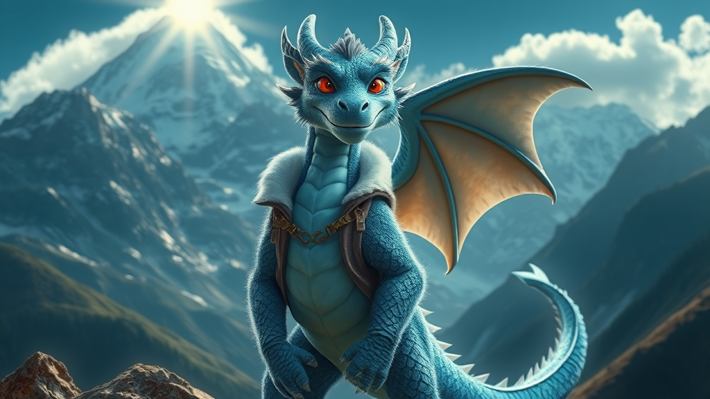 Furry art depiction of a dragon with anthro features, blue fur and skin, confidently standing in a front-facing pose against a majestic mountain backdrop. The dragon is dressed in a soft, fluffy jacket and pants, exuding an aura of strength and comfort. His red eyes gleam with a hint of mystery and friendliness. The scene is bathed in a bloom of light that casts intricate shadows and reflections, enhancing the shiny, ultra-realistic details of his muscular figure. A play of illumination highlights the textures and colors, bringing out the best quality features. The dragon's face bears a distinctly human smile, adding a touch of warmth and character amidst the lush, vibrant setting. This artistic portrayal balances the elegance of detailed realism with the imaginative charm of a fantasy world.