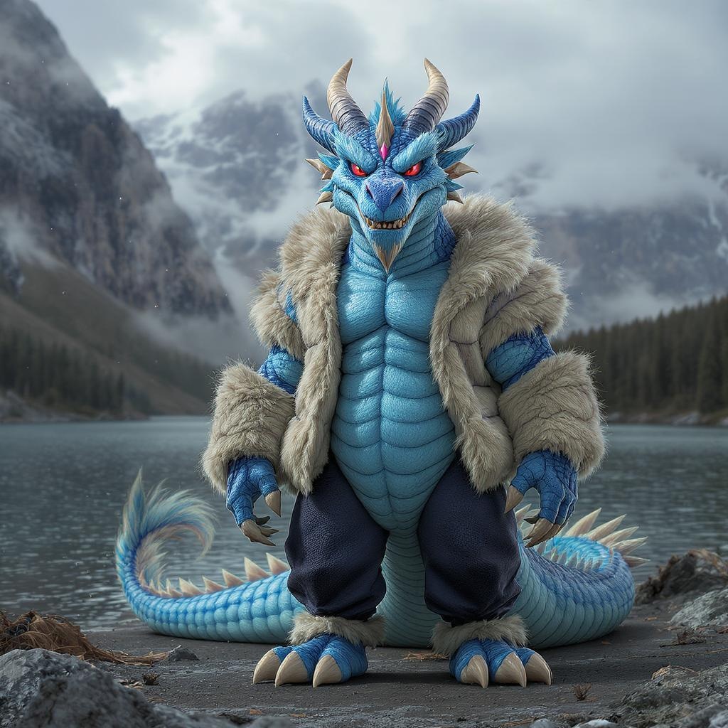 Furry art featuring an anthro, blue-furred and blue-skinned dragon, standing with a front view against a mountain backdrop. The dragon is wearing a soft, fluffy jacket and pants, with striking red eyes. The scene is illuminated with bloom, creating intricate shadows and reflections, adding a shine to the ultra-realistic, ultra-detailed depiction. The dragon sports a muscular build, with a smiling human-like face. The overall quality is of the highest standard, capturing the essence of the furry dragon in vibrant detail, contrasting with elements of water nearby.