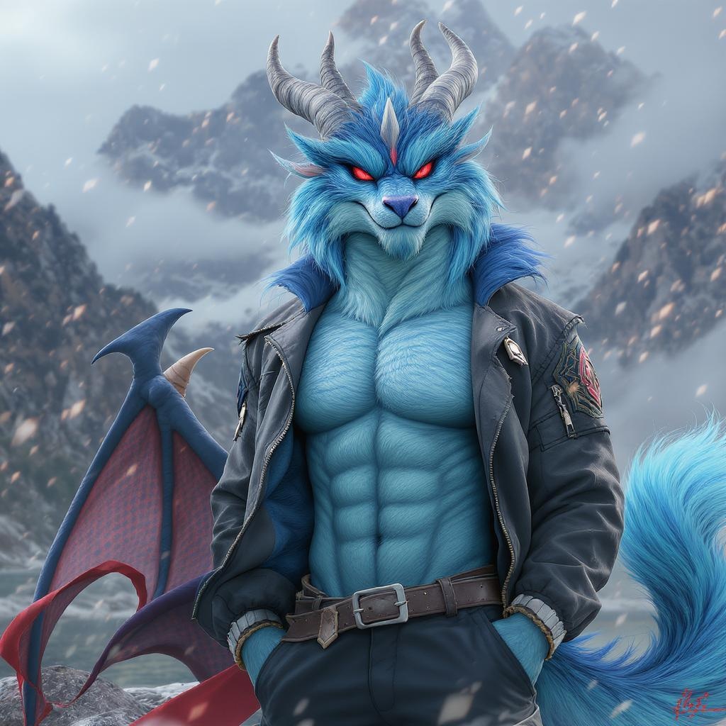 Furry art, showcased on e621, featuring an anthro dragon character with blue fur and skin. The dragon is male, standing confidently with a front view against a majestic mountain backdrop. His fur appears soft and fluffy, and he is dressed in a stylish jacket and pants. Striking red eyes complement his look, adding depth to his expression. The scene is enhanced by delicate bloom effects and intricate illumination, with expertly crafted shadows and reflections that bring a sense of realism and shine to the image. The portrayal is ultra realistic and ultra detailed, highlighting the best quality, with the dragon's muscular physique subtly visible beneath his attire. A hint of water in the background adds more texture and life to this visually captivating piece. The dragon's face shares human-like features, smiling warmly, adding personality and charm to the artwork.