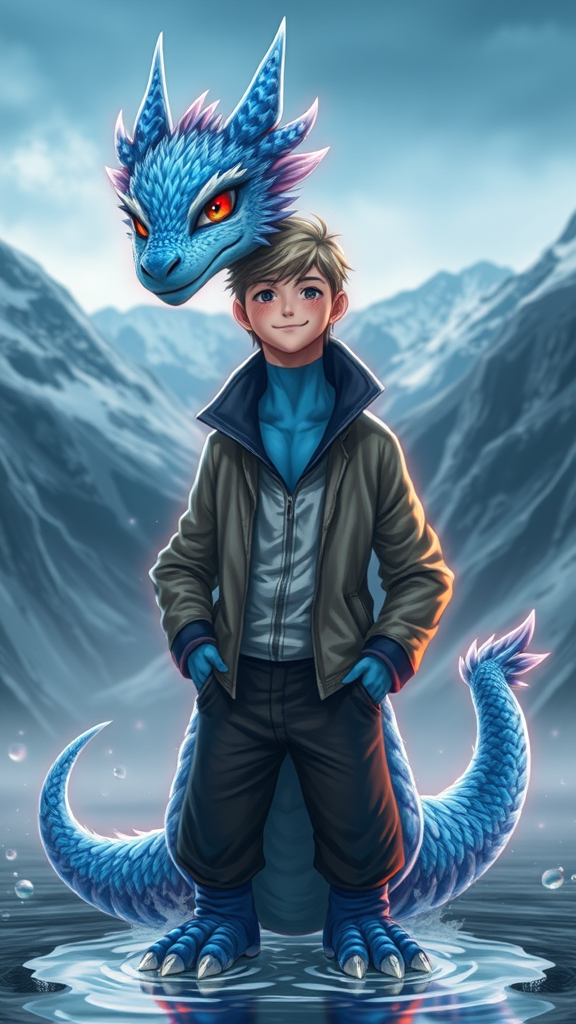 Furry art showcasing an anthro dragon with blue fur and skin, featuring a single male character standing in a front-facing view against a mountainous background. The dragon exhibits soft, fluffy textures and glows with an inner illumination, highlighting shadows and reflections. Dressed in a jacket and pants, the figure has striking red eyes and a friendly smile on a human-like face. Despite being muscular, the figure maintains a refined and inviting appearance. Water elements provide added shine and ultra-realistic detail, while the overall quality remains impressively high.