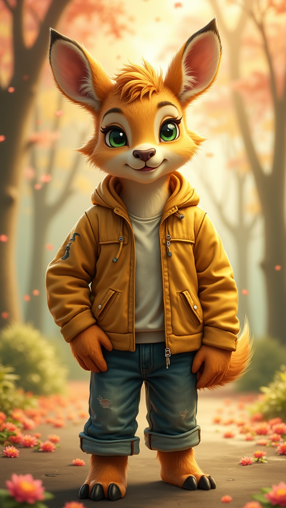 View this AI-generated image featuring furry artwork featuring an anthro deer with yellow fur and skin standing in a park setting the deer character is a muscular male adorned in casual clothing including jeans he has striking green eyes and is depicted with a softly fluffy appearance exuding a real