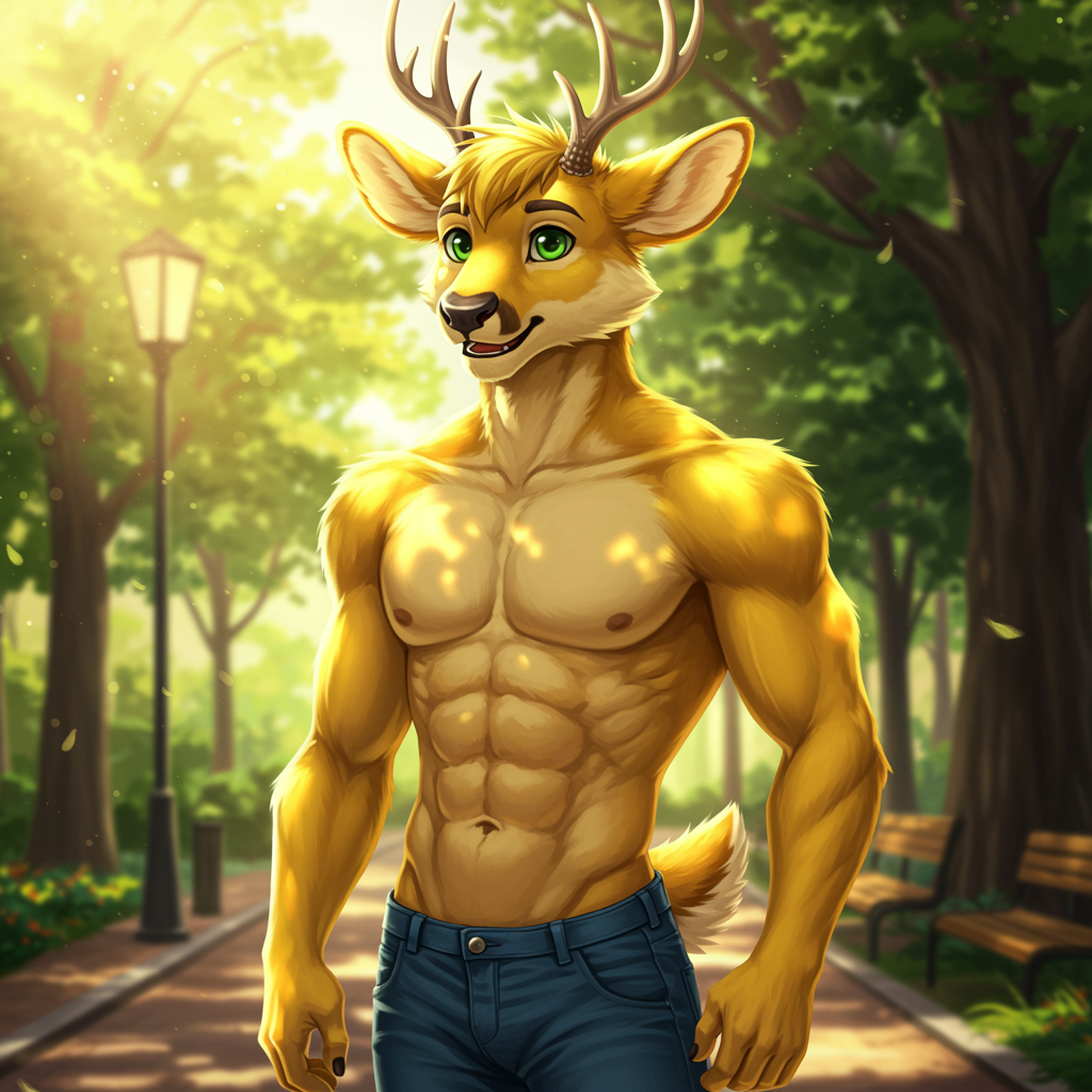 Furry artwork featuring an anthro deer character with yellow fur and skin, standing in a park setting. The deer is male, with striking green eyes and a soft, fluffy appearance, dressed in jeans. The scene is illuminated with natural bloom, casting dynamic shadows and reflections that add a shiny, realistic touch. The character has a muscular build yet maintains a friendly demeanor with a smiling face that merges human and animal features. The artwork is ultra-detailed and of high quality, capturing the essence of a serene, sunlit park with intricate attention to textures and light play, ensuring a vibrant and immersive depiction.