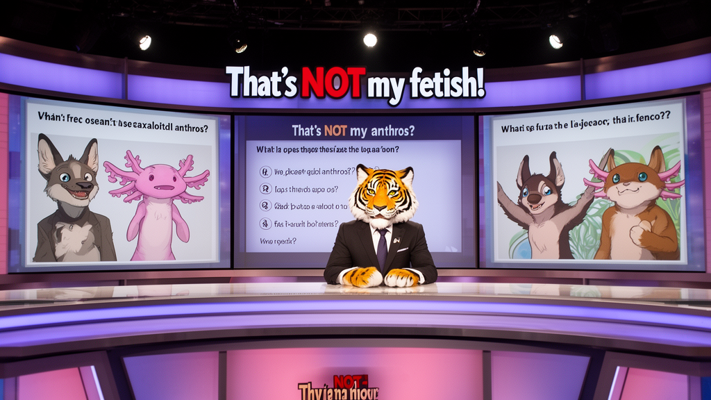 Photo of a TV game show about furries and their weird kinks named "That's NOT my fetish!" featuring suggestive quiz questions and furry artwork from DeviantART. Host of the show is an anthropomorphic tiger man wearing suit. Theme of the question: axolotl anthros.
