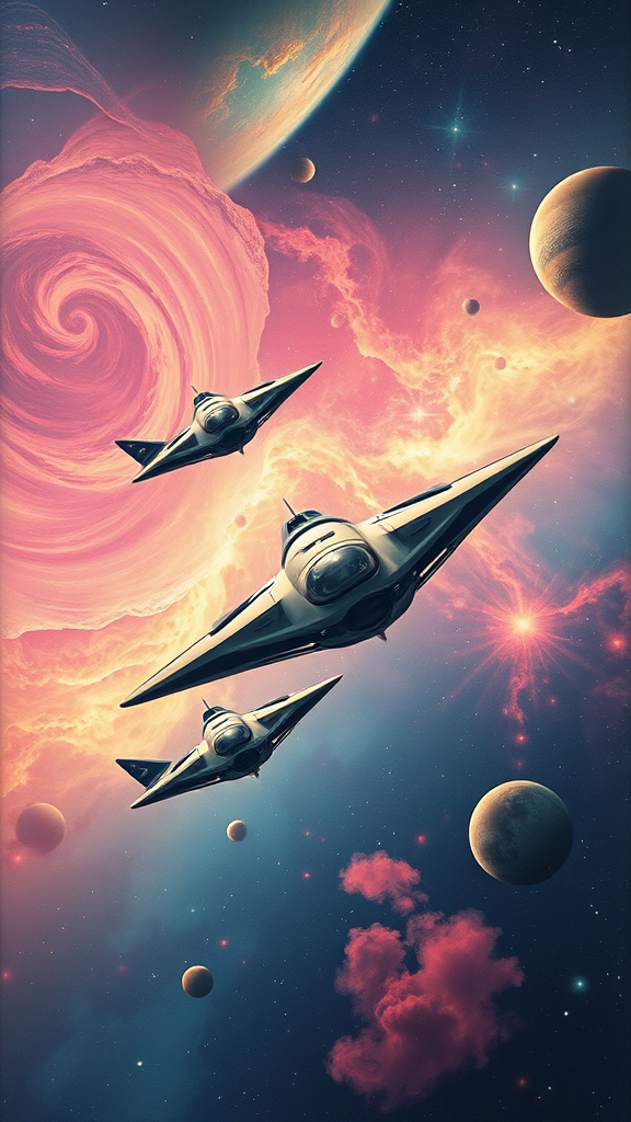 Futuristic 1950s-inspired scene of sleek retro spaceships elegantly soaring through a vibrant and colorful cosmos, with swirling nebulae and distant planets as the backdrop. The image captures a sense of wonder and adventure, showcasing intricate details of the spacecraft design reminiscent of classic science fiction art. The cinematic quality of a Kodak Master View 8x10 camera paired with the Fujinon C 240mm f/9 lens on Kodak Ektar 100 film brings out vivid hues and sharp details, creating a stunning homage to mid-20th-century visions of space travel. The atmosphere is a blend of nostalgia and innovation, with a focus on the harmony between technology and the infinite beauty of outer space.
