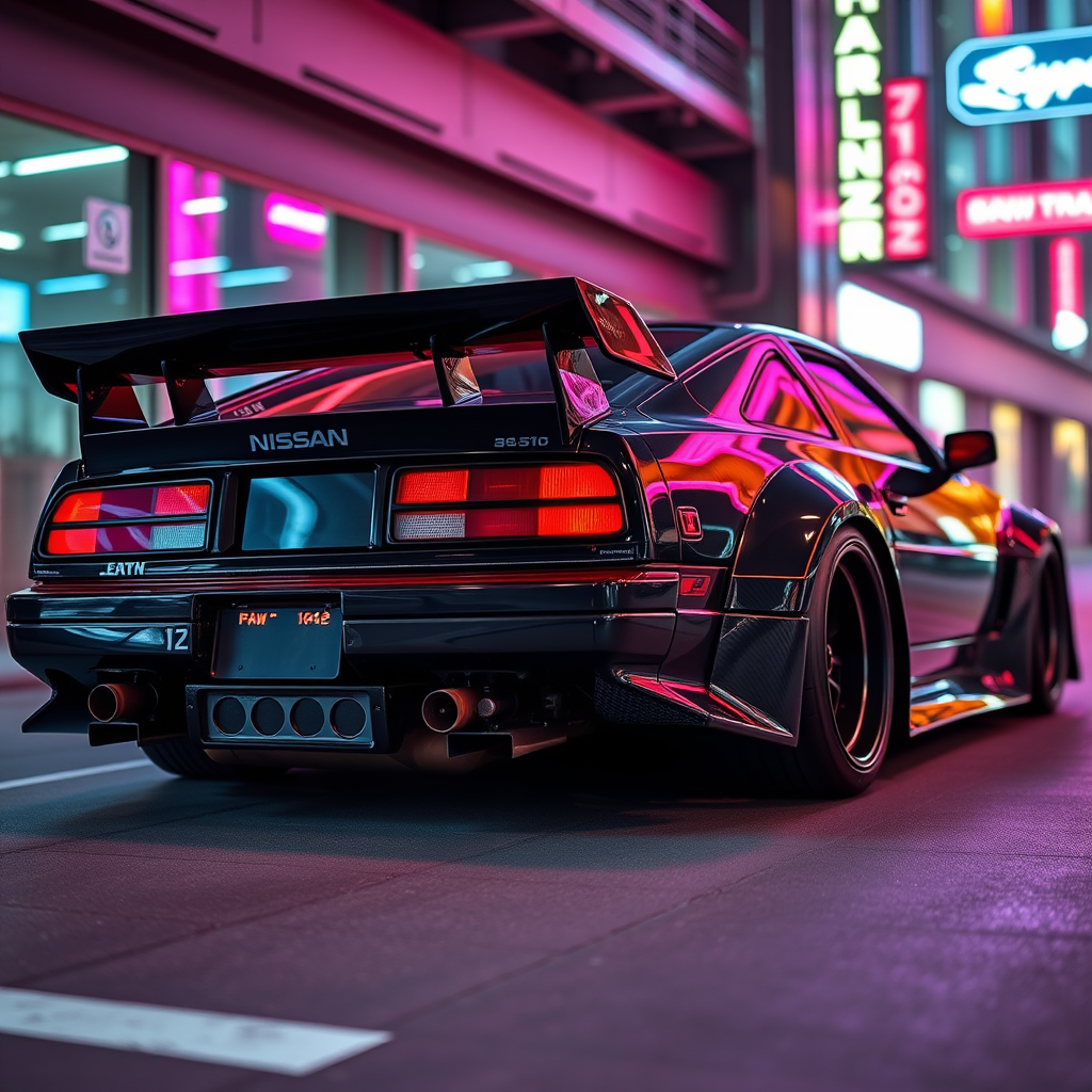 Futuristic 1984 Nissan 300ZX featuring an aggressive wide body with sleek, aerodynamic vents and modernized custom LED tail lights; the car is enhanced with carbon fiber detailing for a dynamic and high-tech look. The vehicle's striking modifications are captured using a Canon D500, on Portra 200 film, delivering a high-resolution RAW photo that highlights the car's glossy finish and unique aesthetic. The setting includes a cyberpunk-inspired urban backdrop with neon reflections accentuating the Nissan's bold design elements.