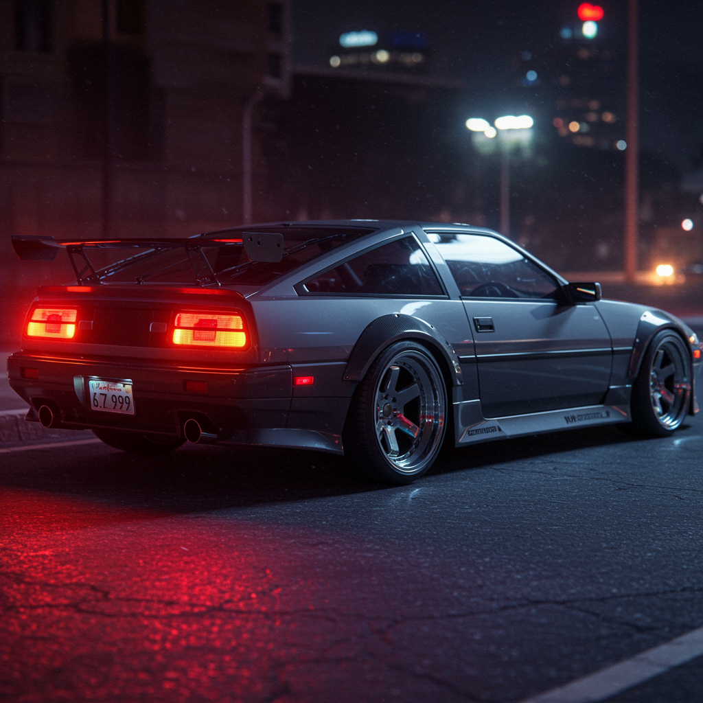 Futuristic 1984 Nissan 300zx featuring an aggressively styled wide body with aerodynamic vents, sleek custom LED tail lights that pulse with a neon glow, and intricate carbon fiber detailing around the chassis. Captured with a Canon D500 on Portra 200 film, the scene is rich with retro-futuristic ambiance, highlighting the car's modern enhancements like digital side mirrors, a low-slung front splitter, and iridescent alloy wheels. The RAW photo captures the texture of the carbon fiber and the metallic sheen of the car under the ambient city lights.