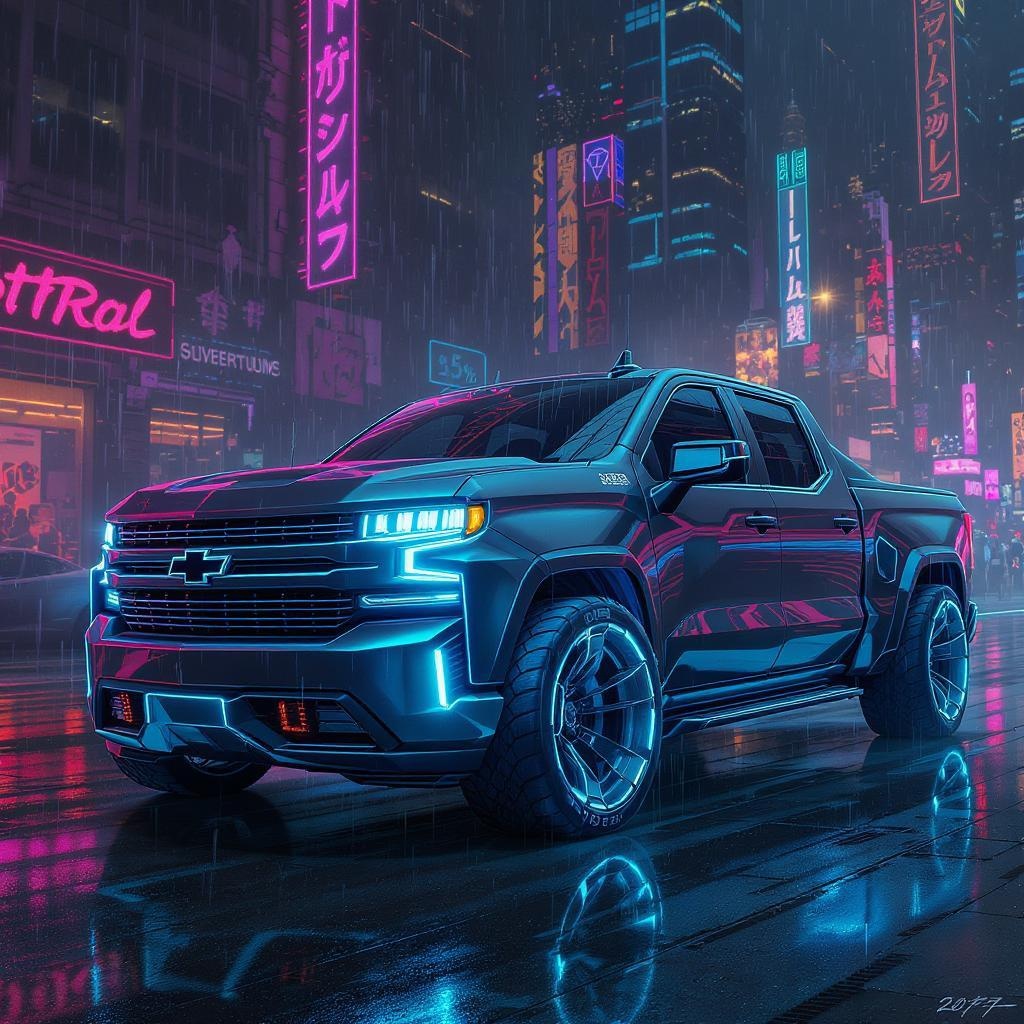 Futuristic 2077 cyberpunk pickup truck concept, heavily inspired by Syd Mead's visionary style, showcasing a sleek, metallic Silverado design with angular contours and neon blue accents, blending advanced technology with rugged durability, set against a neon-lit urban cityscape, emphasizing the fusion of classic utility with next-gen aesthetics.