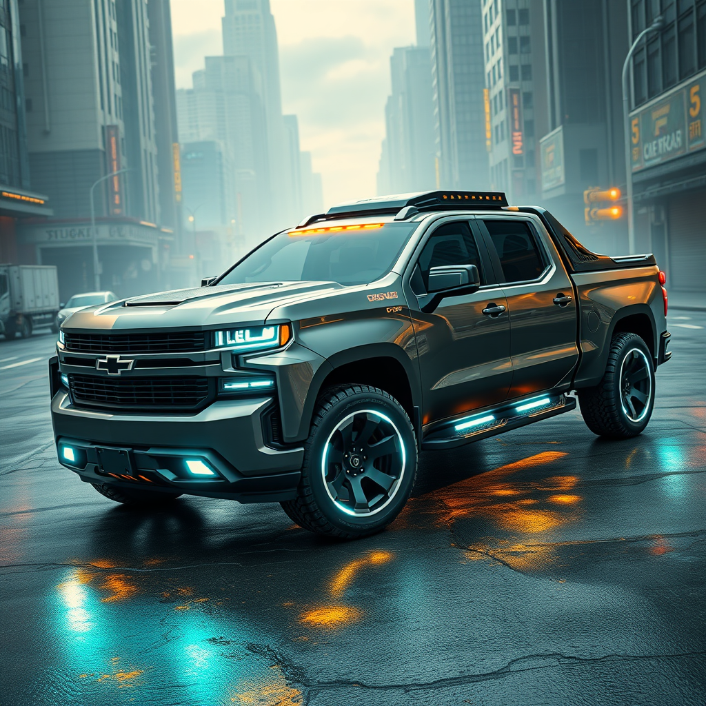 Futuristic 2077 cyberpunk Silverado pickup truck concept, sleek and aerodynamic design, advanced tech features, glowing neon accents, rugged yet sophisticated, urban landscape setting, inspired by Syd Mead's visionary style, blending bold industrial aesthetics with futuristic elegance, metallic hues, high-tech cockpit, and cutting-edge wheels.