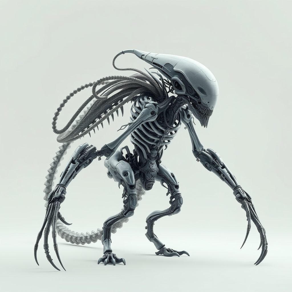 Futuristic alien-cyborg hybrid featuring an intricate exoskeleton of intertwined bones and metallic elements, set against a minimalist backdrop, rendered in stunning hyperrealism and photorealistic detail, ultra-high-definition 8k resolution, using advanced 3D rendering techniques, showcasing expressive design and dynamic textures that enhance its otherworldly appearance.