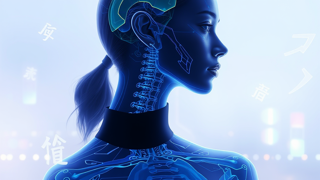 Futuristic and ethereal portrait of a woman with translucent skin revealing her inner anatomy, inspired by Japanese cyberpunk aesthetics. She glows with a bioluminescent neon blue, reminiscent of Tokyo's neon nights. Her profile is accentuated by a sleek black high-collared outfit adorned with technological patterns influenced by Japanese design. Surrounding her are subtle holographic kanji symbols, merging tradition with futurism. The background features a misty white gradient suggesting a cybernetic city shrouded in fog, enhancing a surreal and high-tech ambiance. A cool, futuristic lighting in a pale purple hue softly illuminates her bone structure, creating an X-ray effect. Rendered in Unreal Engine 5, with translucent textures, holographic effects, and cinematic lighting, combining minimalist elegance and hyperrealism in a sophisticated Japanese cyberpunk style.