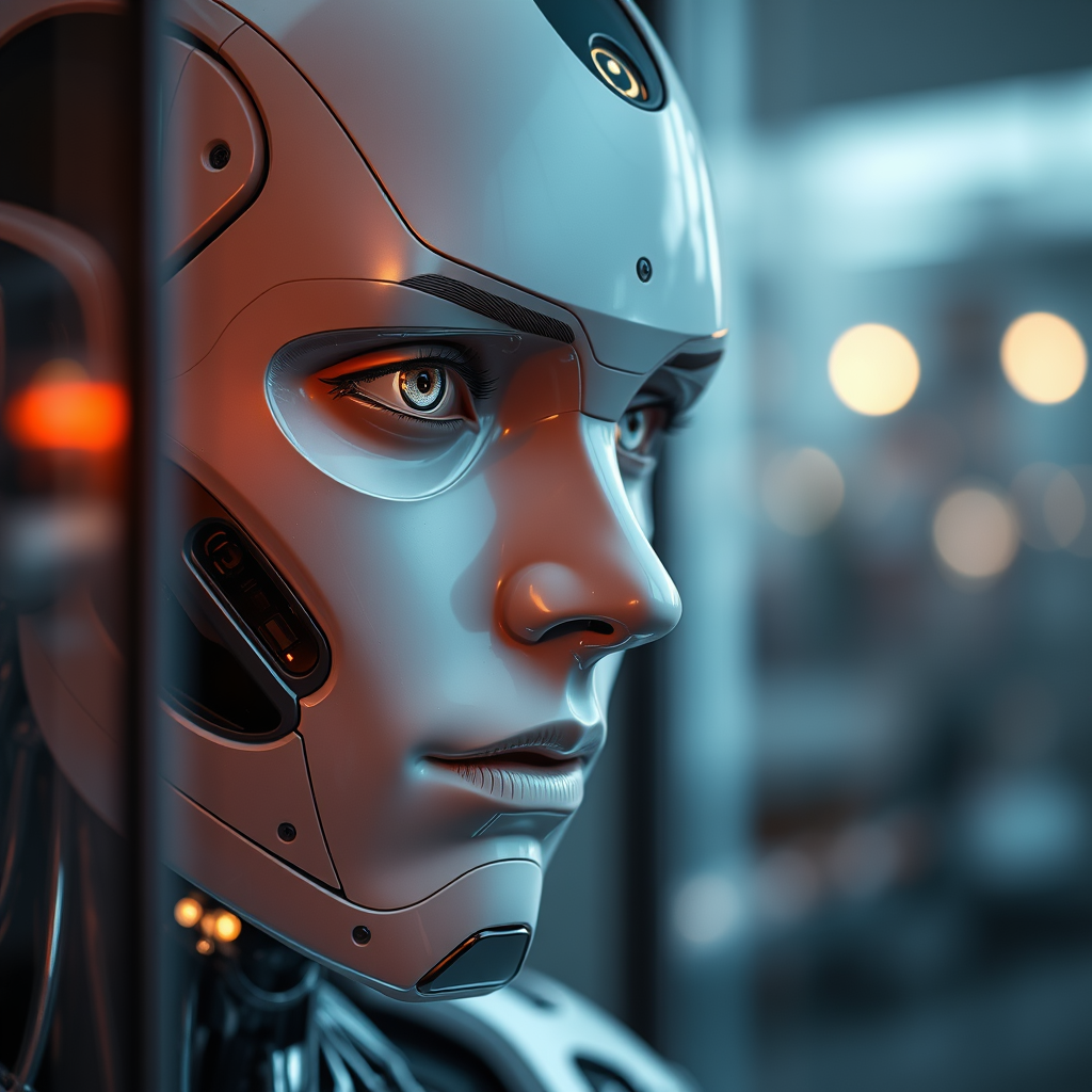 Futuristic android gazing through a window, detailed close-up of a human-faced robot, intricate humanoid features, advanced AI expression, technologically evolved android portrait, profound artificial intelligence essence, nearing AI singularity, lifelike robot representation, modern humanoid design, intelligent machine persona.