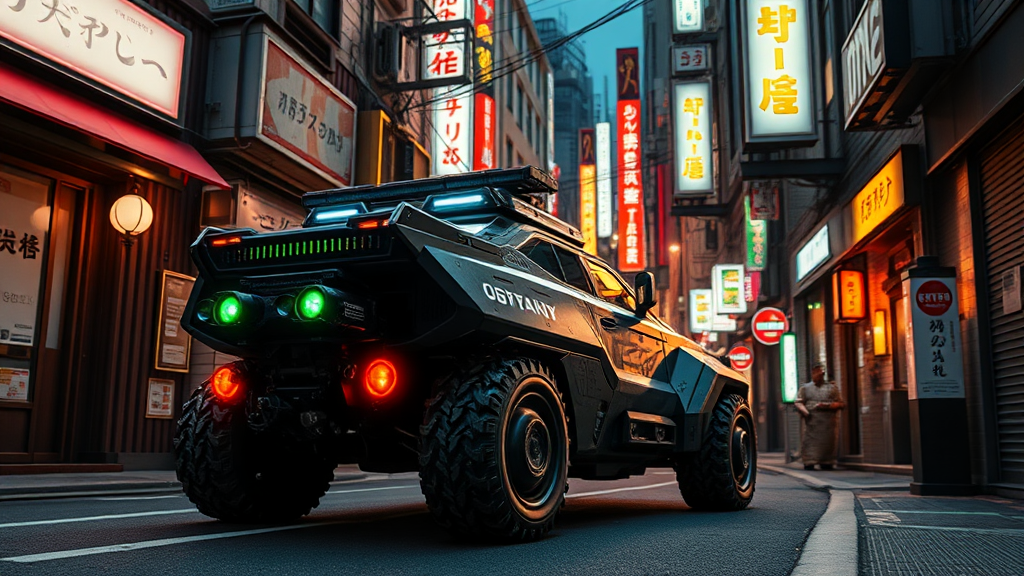 a cyberpunk-inspired futuristic armored vehicle maneuvering through the narrow alleyways of a neon-lit Japanese metropolis, its sleek design and advanced technology contrasting with the traditional architecture surrounding it.