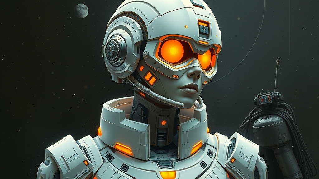 Futuristic artwork inspired by roblunda mccallum, featuring a full-body figure, with intricate, blink-and-you-miss-it details, rendered in dark whites and vibrant light oranges. This piece captures the essence of sci-fi realism, reminiscent of classic pulp comics, blending airbrush techniques with comic art aesthetics. The composition unfolds in a vertical aspect ratio, immersing viewers in a stunning visual narrative that balances stylization and realism.