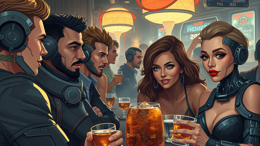futuristic bar scene with diverse people enjoying drinks, enveloped by fascinating sci-fi robotic cyborgs featuring intricate mechanical and sci-fi designs, ultra-detailed, hyper-realistic, cinematic ambiance, masterful composition, inspired by Federico Pelat and Jan Urschel, artstation quality, capturing vibrant interaction, painting, cel-shaded style, emphasis on expressive make-up, bold lipstick, bionic elements subtly integrated, creating an engaging atmosphere.