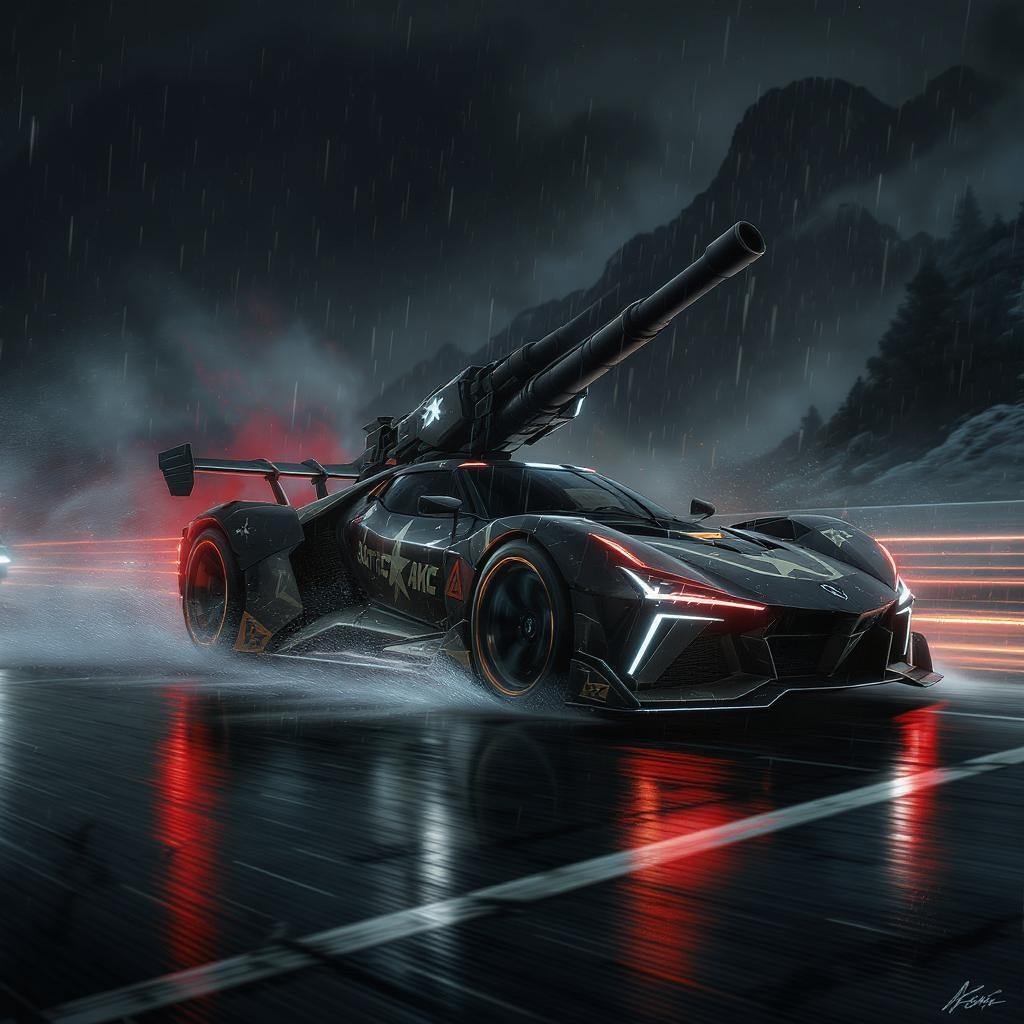 Futuristic battle car featuring sleek military graphics, complete with a massive cannon, racing down a drenched highway in a high-speed, illegal race. The scene exudes a moody, dark atmosphere reminiscent of cyberpunk and Blade Runner aesthetics. The cinematic action unfolds with precise detail, capturing the smooth, sharp focus of a digital painting worthy of cover art. This full-view concept art is intricately designed, perfect for ArtStation, boasting 4k and 8k quality in illustration through digital art, creating a visually rich and immersive depiction ideal for an intense and gripping movie action scene.