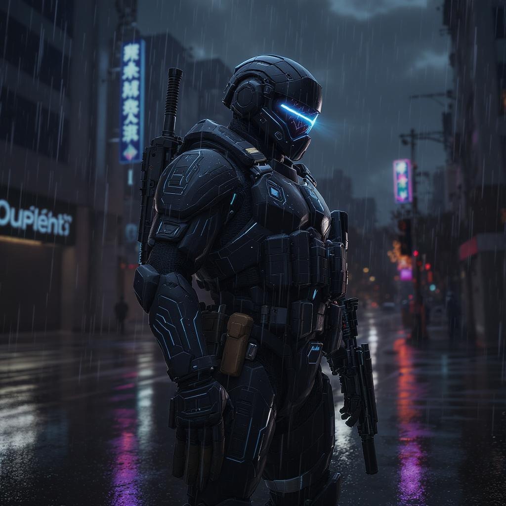 Futuristic battle-ready soldier clad in cutting-edge armor equipped with high-tech weaponry and sophisticated gadgets, situated on an urban street under an overcast sky, showcasing reflection mapping and elaborate design with meticulous details; dramatic lighting enhances the hyperrealism and photorealistic quality, creating a cinematic scene, with 8k resolution rendering reminiscent of an Unreal Engine environment, aspect ratio 9:16, stylized with slight artistic modifications for enhanced visual impact.