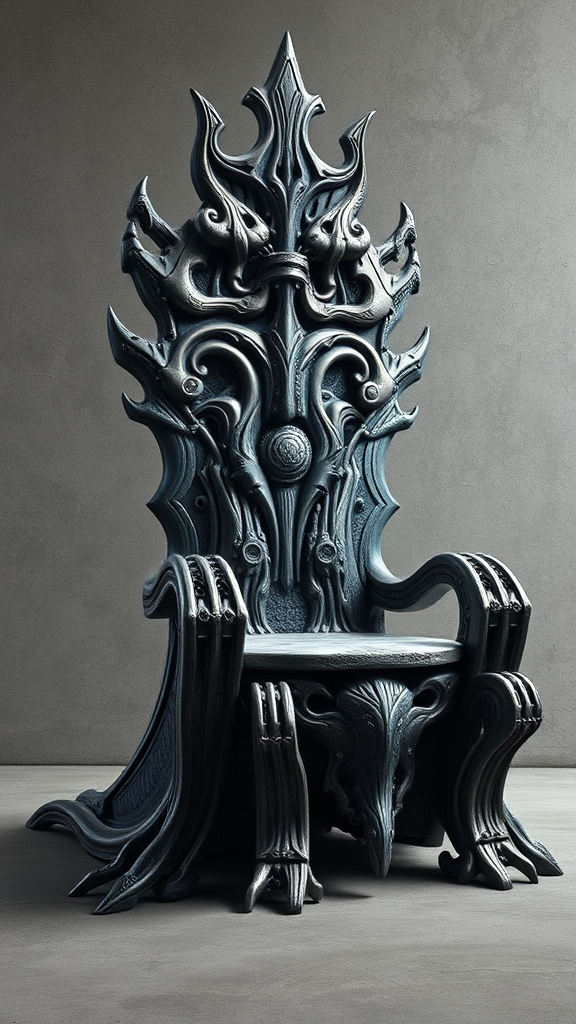 Futuristic biomechanical throne inspired by HR Giger, featuring intricate alien-like designs and organic curves, concept furniture art, painted on a textured grey background, hyper-realistic illustration, digital art masterpiece, trending on artstation for its complexity and detail, showcasing fine, meticulous patterns, viewed diagonally to emphasize the elaborate structure.