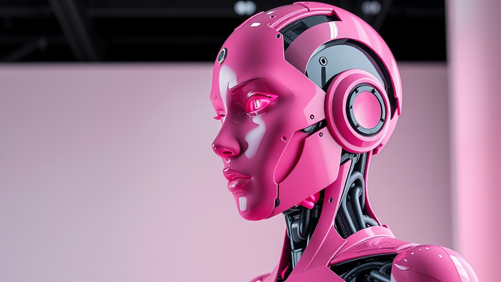 futuristic bionic woman sculpture with a glossy ceramic pink finish, prominently featured against a minimalist backdrop, illuminated with bright lighting to highlight ultra-realistic details, incorporating modern design elements in a 3:4 aspect ratio, while maintaining a sleek and raw aesthetic