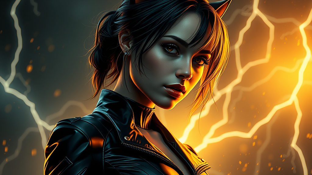 Futuristic black leather suited woman in animated gif style, with soft-focused realism, splattered drips of golden light, surrounded by lightning waves, infused with catcore elements, in a neo-Victorian setting, highlighting a dramatic interplay of shadow and luminescence.