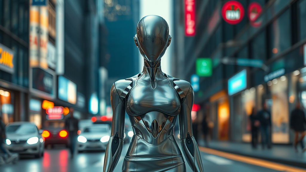 Futuristic city street scene featuring a sleek android with a faceless, shiny silver metal body, wearing a contemporary mini skirt. The android walks confidently, drawing attention with its piercing gaze at the viewer. Captured in a high-resolution, hyper-realistic photography style, the scene reveals intricate skin detailing and reflective surfaces under diffused soft lighting. The shallow depth of field and sharp focus emphasize the android's intricate design, set against a bustling urban background. The cinematic lighting adds an otherworldly glow, enhancing the vibrant colors and realistic textures. This detailed portrait is an 8k full-length frame, showcasing captivating sci-fi aesthetics.