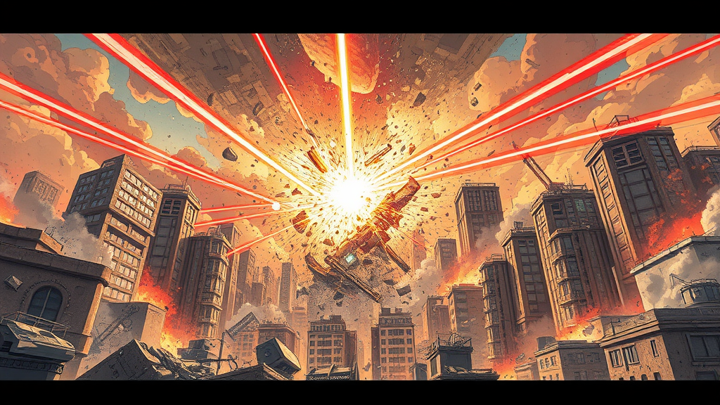 Futuristic cityscape in ruins, inspired by Tsutomu Nihei's intricate style, featuring high-detail laser destruction; a powerful laser beam descends from the sky, causing devastation at the point of impact. Intense acceleration and a blinding flash of light; debris and shattered buildings scatter in the surge, captured in hyper-realistic, anime-influenced illustration. 8K HD resolution, sharp manga graphics, emphasizing the chaos and speed of the scene.
