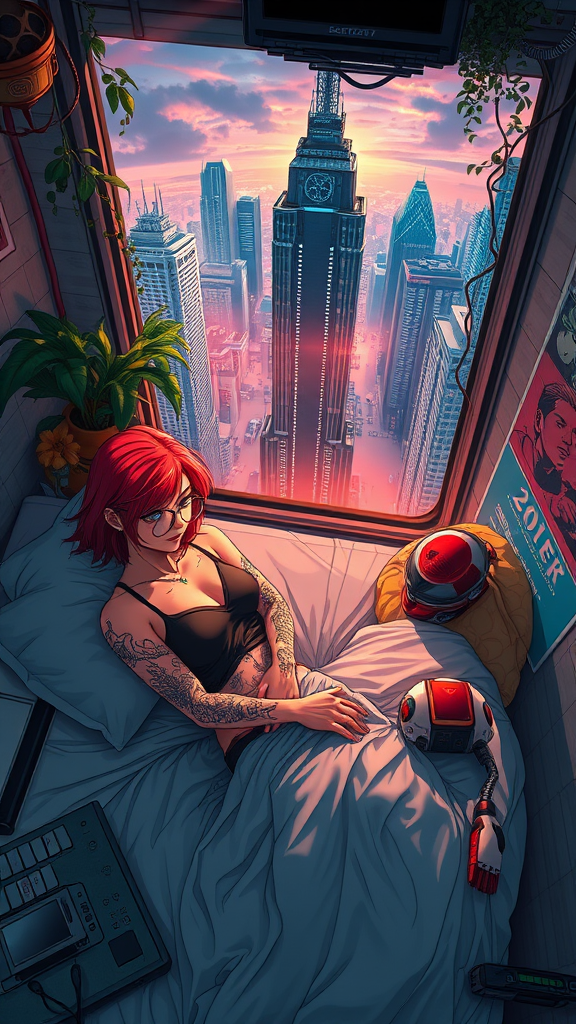 Futuristic cityscape, inspired by Ghost in the Shell, Room 2077; a young woman with intricate tattoos and striking red hair wearing glasses, reclined on a bed from a top-down view; a small robot companion hovering nearby, surrounded by an array of mechanical paraphernalia; a plant-laden window reveals towering skyscrapers against a vibrant sunrise backdrop. The walls are adorned with atmospheric and aesthetic posters, capturing an ultra-detailed, anime-inspired essence with an abundance of intricate details.