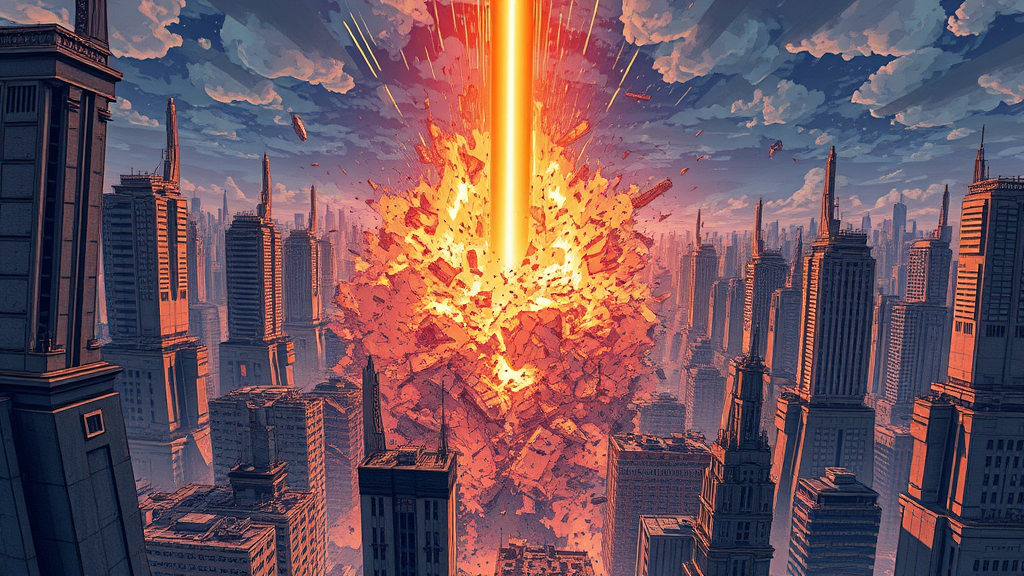 Futuristic cityscape laid to waste, inspired by Tsutomu Nihei, intricately detailed; a powerful laser blast descends from the heavens, obliterating structures with sheer force. The moment captures the laser's impact with accelerated momentum, a blinding flash of light and speed showcasing the chaos. The scene is rendered in anime style, intricately drawn with manga graphics, ultra-high-definition, 8K, and super-resolution, capturing every nuance of destruction in a panoramic view.