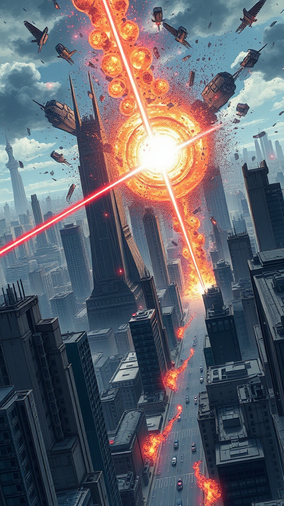 Futuristic cityscape obliteration, inspired by Tsutomu Nihei's intricate design, intense detail, searing laser beam, catastrophic ruin, celestial laser strike, explosive impact, rapid acceleration, blinding flash of light, supersonic speed, anime influence, detailed drawing, high definition, ultra-high resolution, manga-style graphics, showcasing vertical composition, dynamic energy, and surreal chaos.