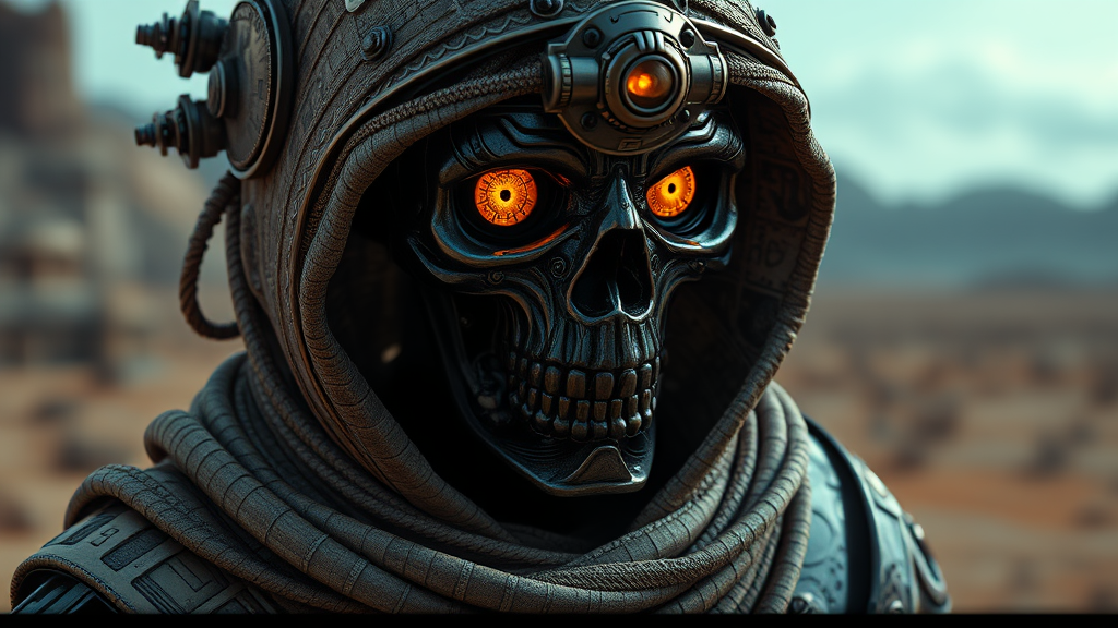 Futuristic clockwork mummy with detailed mechanical components, luminous amber eyes, ominous expression, enveloped in ancient wrappings, ornate metallic headdress, arid landscape backdrop, rendered in Unreal Engine 4, 3D with dramatic illumination.