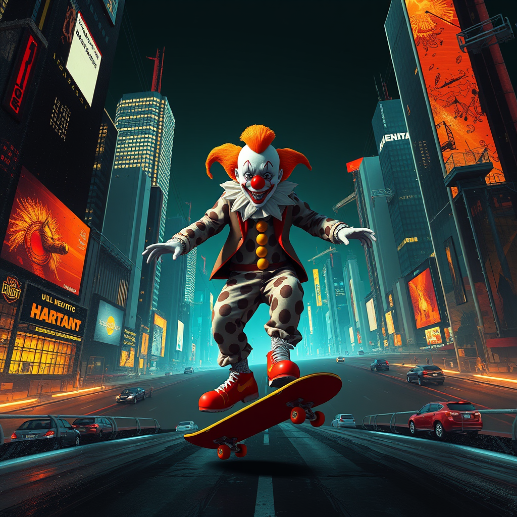 "Futuristic clown skateboarding through an abstract cityscape, 3D digital rendering, blending contemporary and surreal elements, vibrant high contrast with rich dark tones contrasted by shimmering golden highlights."