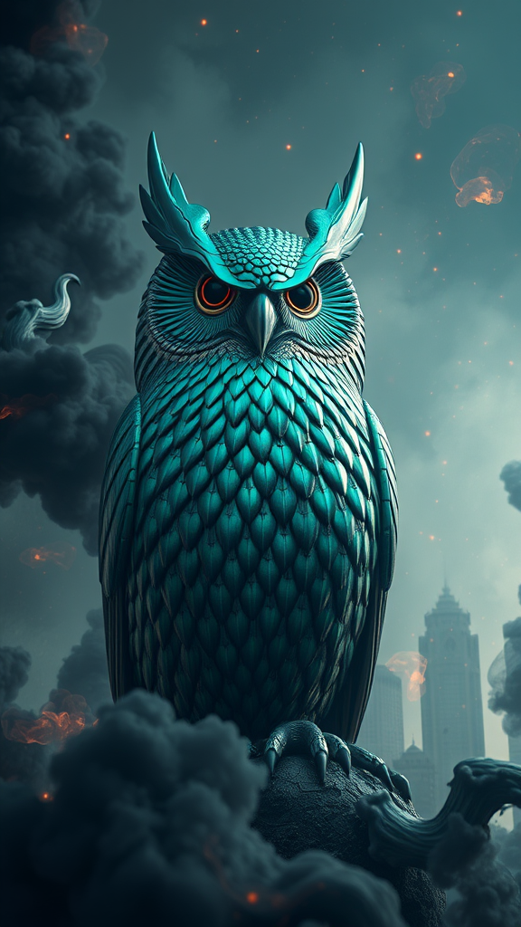Futuristic colossal owl deity with a metallic emerald exterior, intricately detailed in the style of Vincent van Gogh, infused with FW Murano glass artistry. The owl is adorned in a galaxy-themed full-body armor, surrounded by swirling jet black and crimson smoke plumes. The setting captures an ultra-realistic and dark atmospheric effect, offering epic ultra-wide cinematic views.