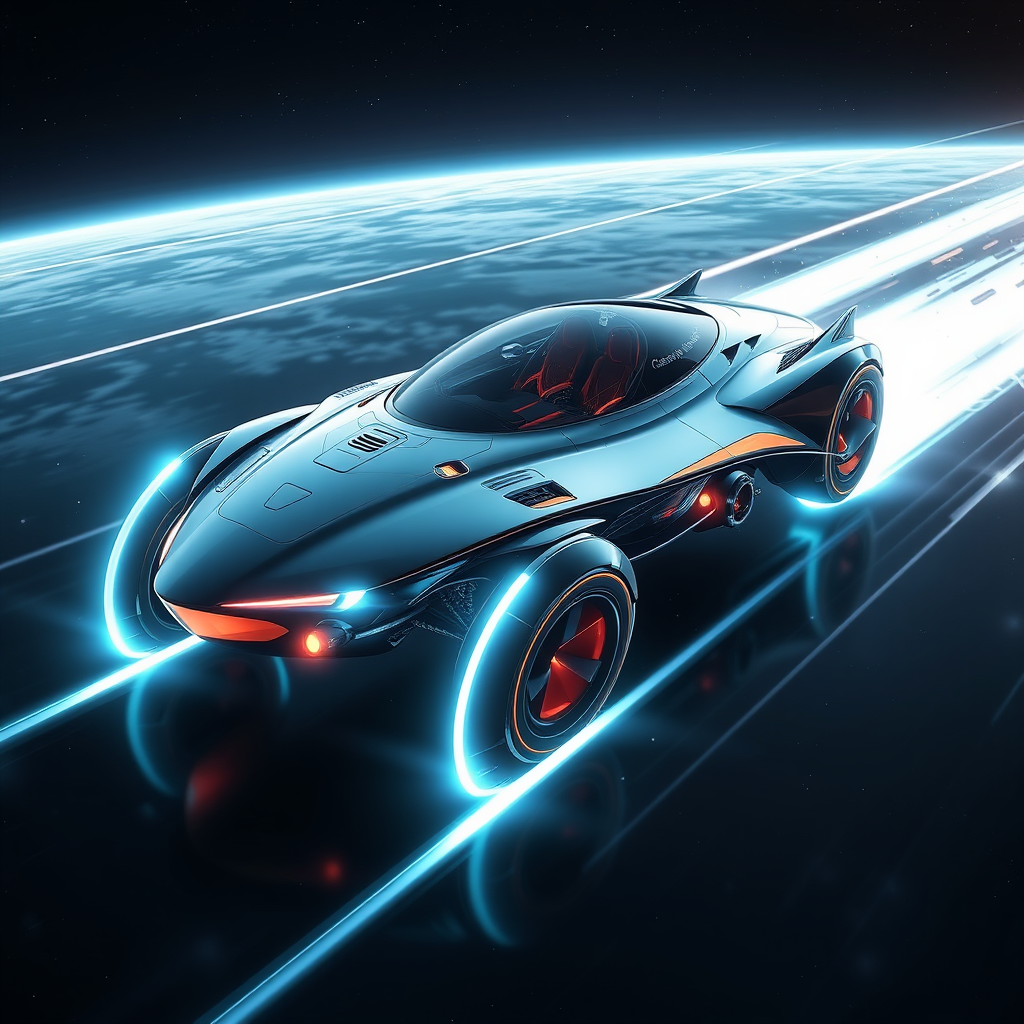 Futuristic cosmic-inspired vehicle with sleek aerodynamic design, featuring luminous plasma trails and advanced gravitational suspension system, powered by a star-core engine for interplanetary adventures.