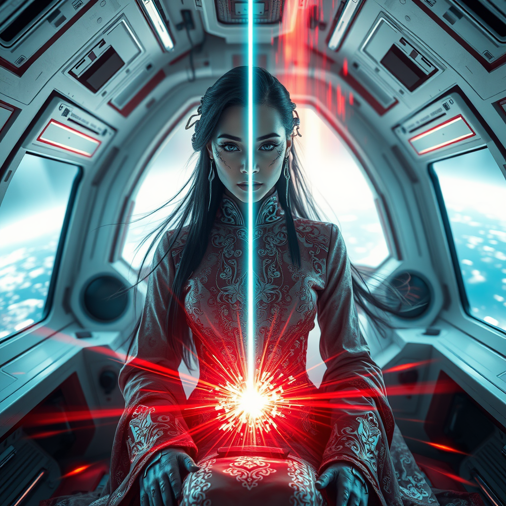 Futuristic cyber-enhanced woman with cyberpunk-inspired prosthetics, adorned in an intricately designed Chinese gown, flowing long hair framing her features, positioned inside an advanced spaceship, encapsulating a sci-fi theme with exceptional detail. At the core, a vibrant laser beam emerges, converging with energy clots, creating a dynamic centerpiece. Above, a laser descends from the sky, igniting a cascade of light and motion, embodying the essence of acceleration and speed. This scene captures a photorealistic and hyper-realistic aesthetic, painted with vivid clarity. Presented in cinematic quality, utilizing long exposure and advanced super-resolution technology to ensure an 8K ultra-HD depiction, emphasizing the contrasts and nuances, inviting the viewer into a realm of intensified visual storytelling.