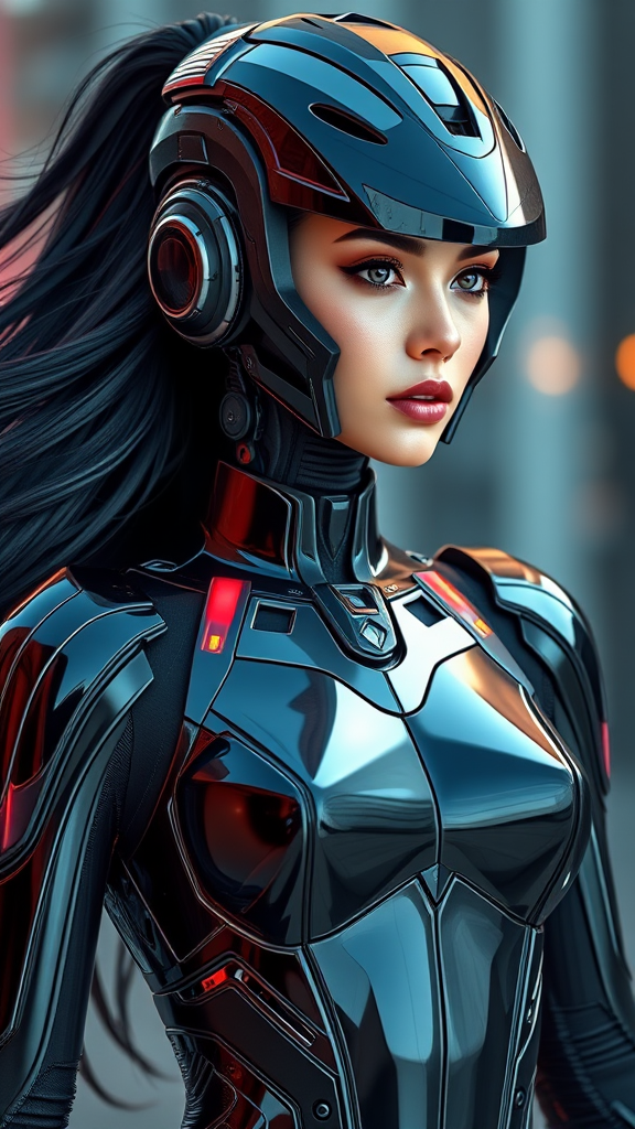 futuristic cybernetic woman in a sleek dark glossy armor bodysuit with flowing black hair, advanced headgear featuring a mechanical facial visor, intricate body armor details, high dynamic range lighting, realistic skin with subsurface scattering, rendered in ultra-high-definition 8K, with subtle neon highlights reflecting off the armor's surface.