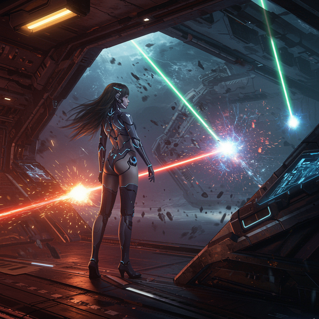 Futuristic cybernized girl with sleek cyberpunk prosthetics and a single stocking, her long hair flowing as she stands inside a sprawling spaceship, exuding a sci-fi vibe. The scene is hyper detailed and photorealistic, with a powerful laser emanating from the center and another piercing the sky. Surrounded by swirling energy clots, the atmosphere is filled with acceleration and flashes of light. This cinematic painting captures a dynamic sense of speed in 8K super-resolution, showcasing a long exposure to enhance its hyper realism.