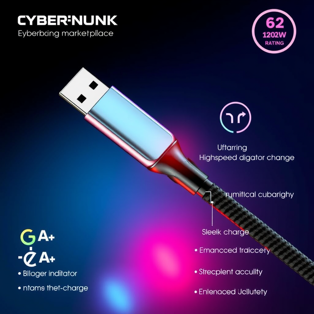 Futuristic cyberpunk marketplace listing featuring a USB Type-C ultra high-speed charging cable with a 6A 120W power rating, integrated LED charge indicator, and enhanced durability with sleek neon accents for a cutting-edge charging experience.