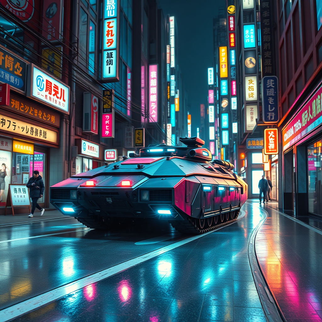 Futuristic cyberpunk military hover-tank navigating through the narrow alleys of a neon-lit Japanese city, blending advanced technology with urban street culture, glowing holographic billboards casting colorful reflections on sleek metallic surfaces.