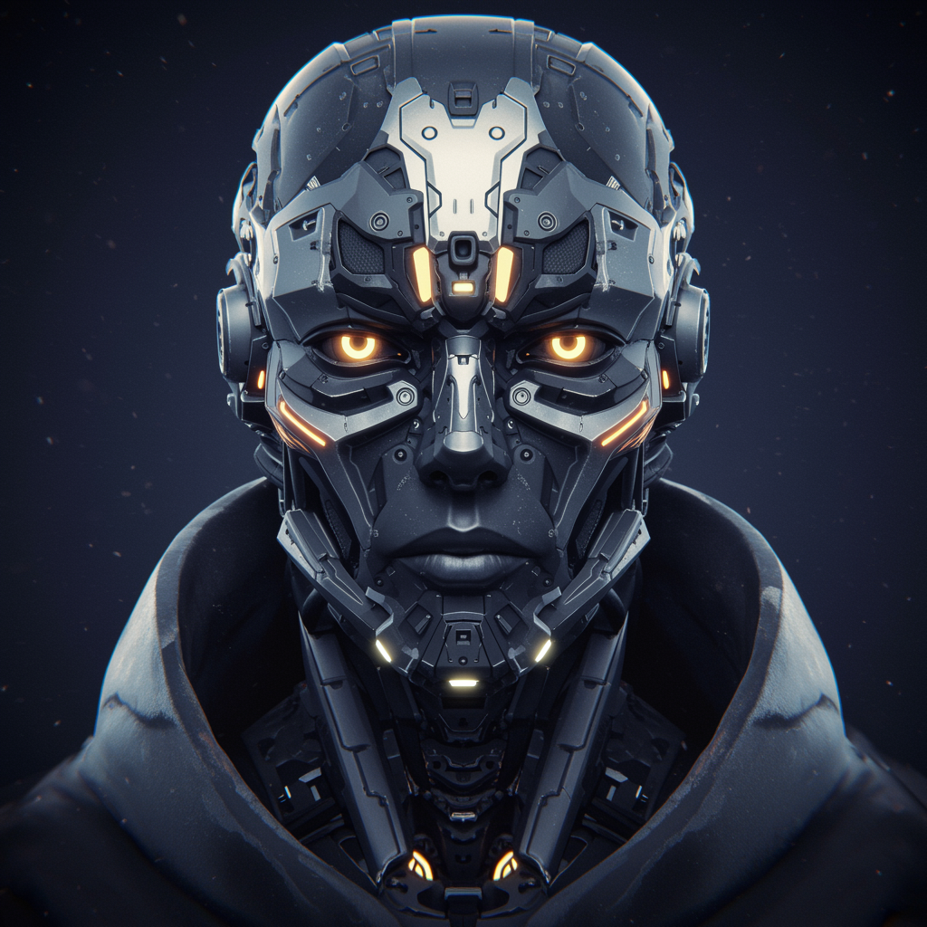 futuristic cyberpunk military robot character design featuring stealth elements, glowing accents, and smooth hard surfaces; the face is highly detailed with intricate symmetrical features, rendered in real-time with vfx and volumetric ambient lighting. The design combines digital 3D with uhd and hdr cartoon-like qualities, blending anime and digital painting aesthetics. The robot resembles an abstract metal sculpture, with a cyborg appearance that integrates human elements. Asymmetrical details and strategically placed holes create an edgy look, avoiding poor art techniques like off-frame compositions, blurry or gross proportions, unnecessary signatures, words, or watermarks.