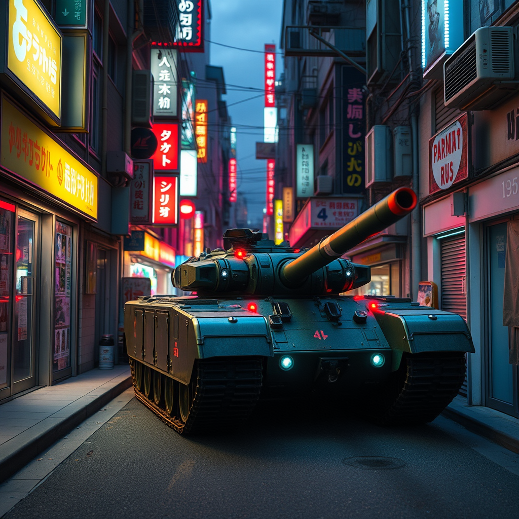 futuristic cyberpunk military tank navigating narrow alleyways of a neon-lit Tokyo backstreet